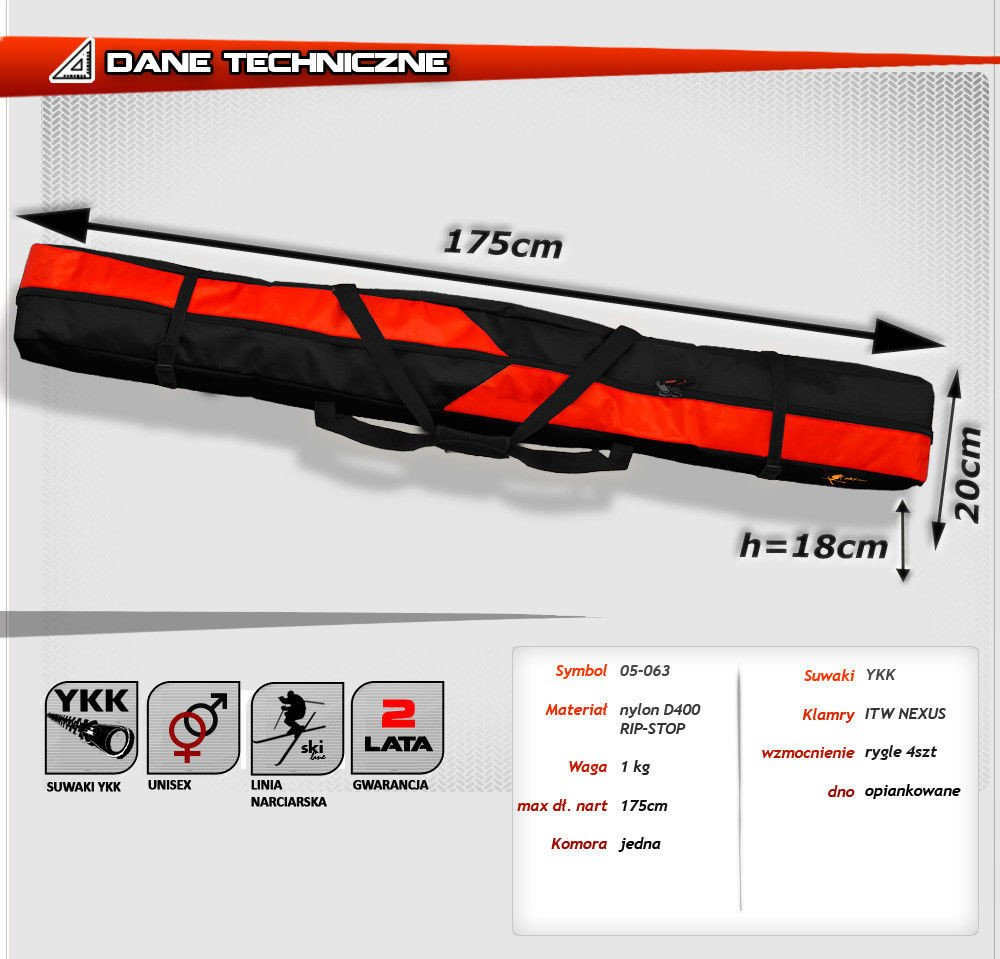 Der Skisack ist sehr bequem zu bedienen. Sie wurde mit einem funktionellen Klettverschluss ausgestattet, dank dem sie sowohl auf der Schulter als auch in der Hand getragen werden kann – je nach den individuellen Vorstellungen des Verbrauchers. Die Tasche ist darauf ausgelegt Ski bis 175 cm und Skistöcke tragen. Die Innenwände der Hülle sind mit weichem Schaumstoff gepolstert, wodurch die Skiausrüstung im Inneren widerstandsfähig gegen mechanische Beschädigungen ist. Ski und Stöcke werden separat befestigt, damit sie sich nicht berühren beim Transport aneinander stoßen. Die Kammer hat auch ein Belüftungsloch, das mit einem dichten Netz bedeckt ist. Sein Einsatz dient vor allem dazu, Schneeresten auf Skiern und Stöcken Feuchtigkeit zu entziehen. Die Kammer ist mit zwei starken Reißverschlüssen befestigt Köpfe auf dem Band, hergestellt von YKK.