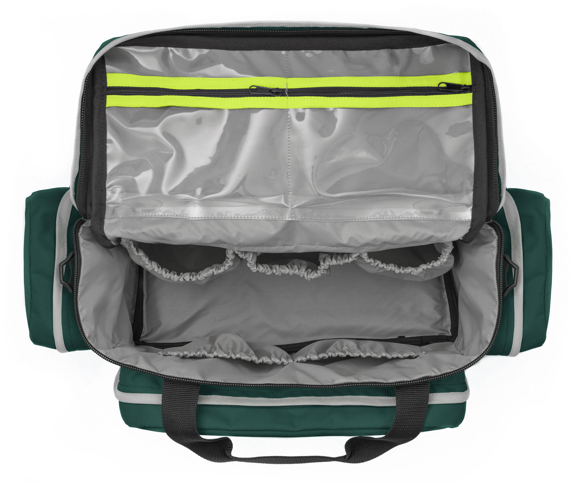 Dos bolsillos laterales, ideal para colocar, por ejemplo, un tensiómetro, estetoscopio, contenedor de agujas usadas, etc. Cada uno tiene agarraderas de goma y compartimentos.